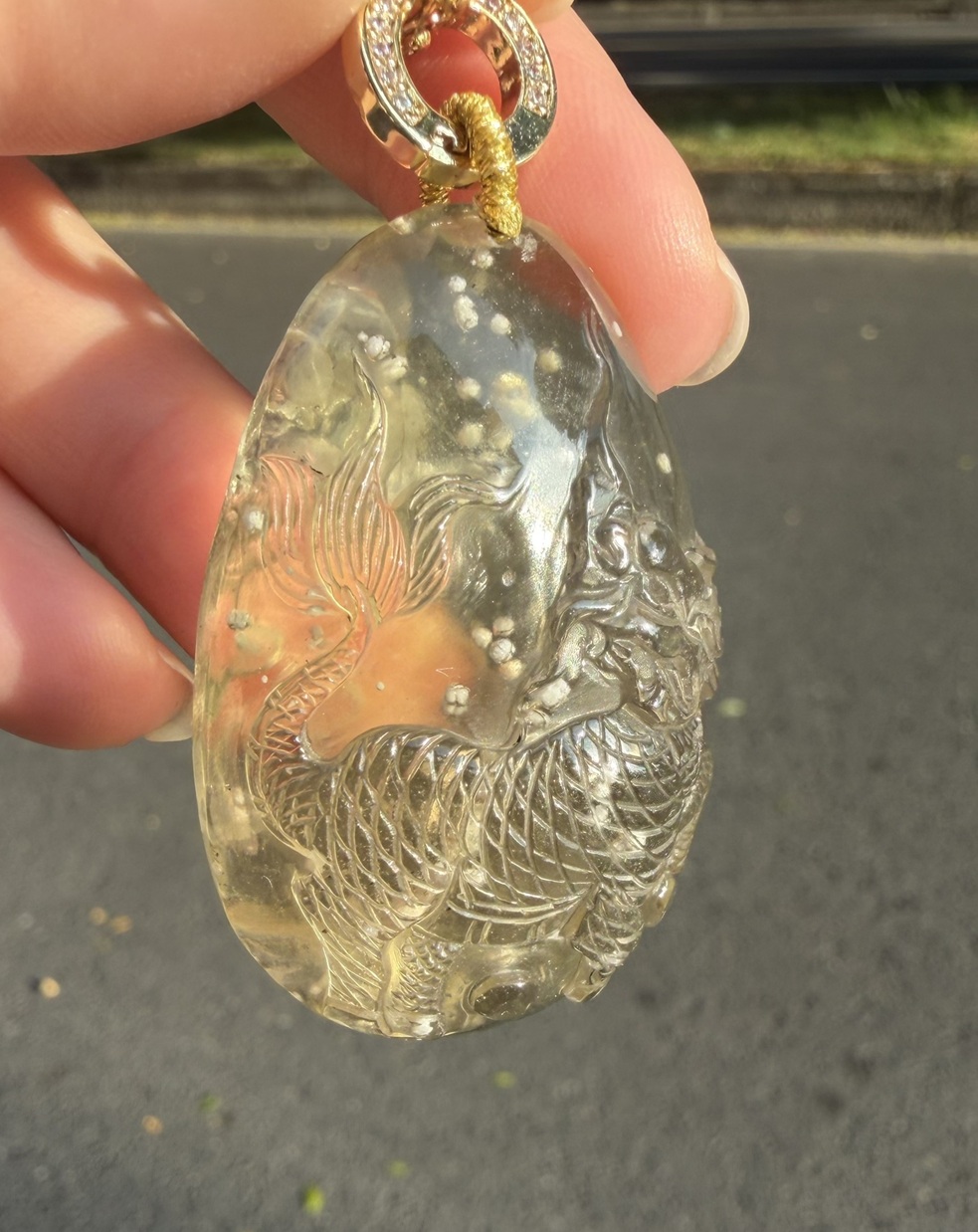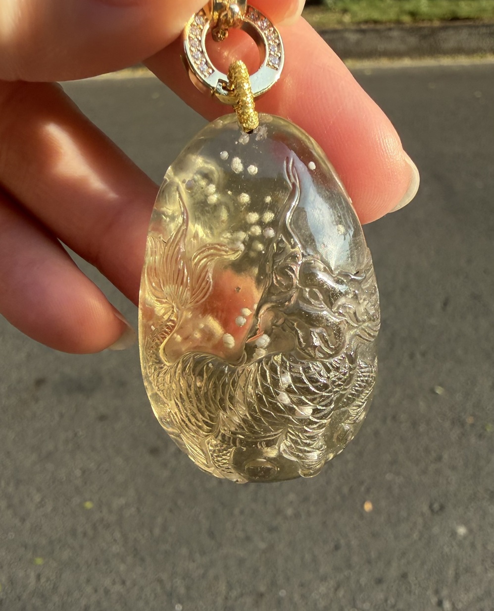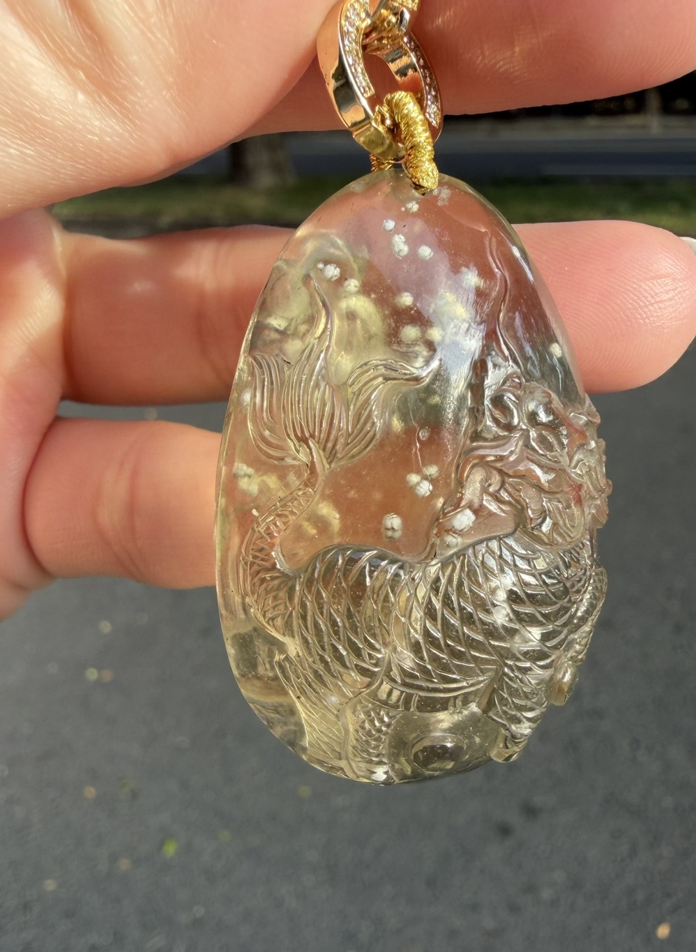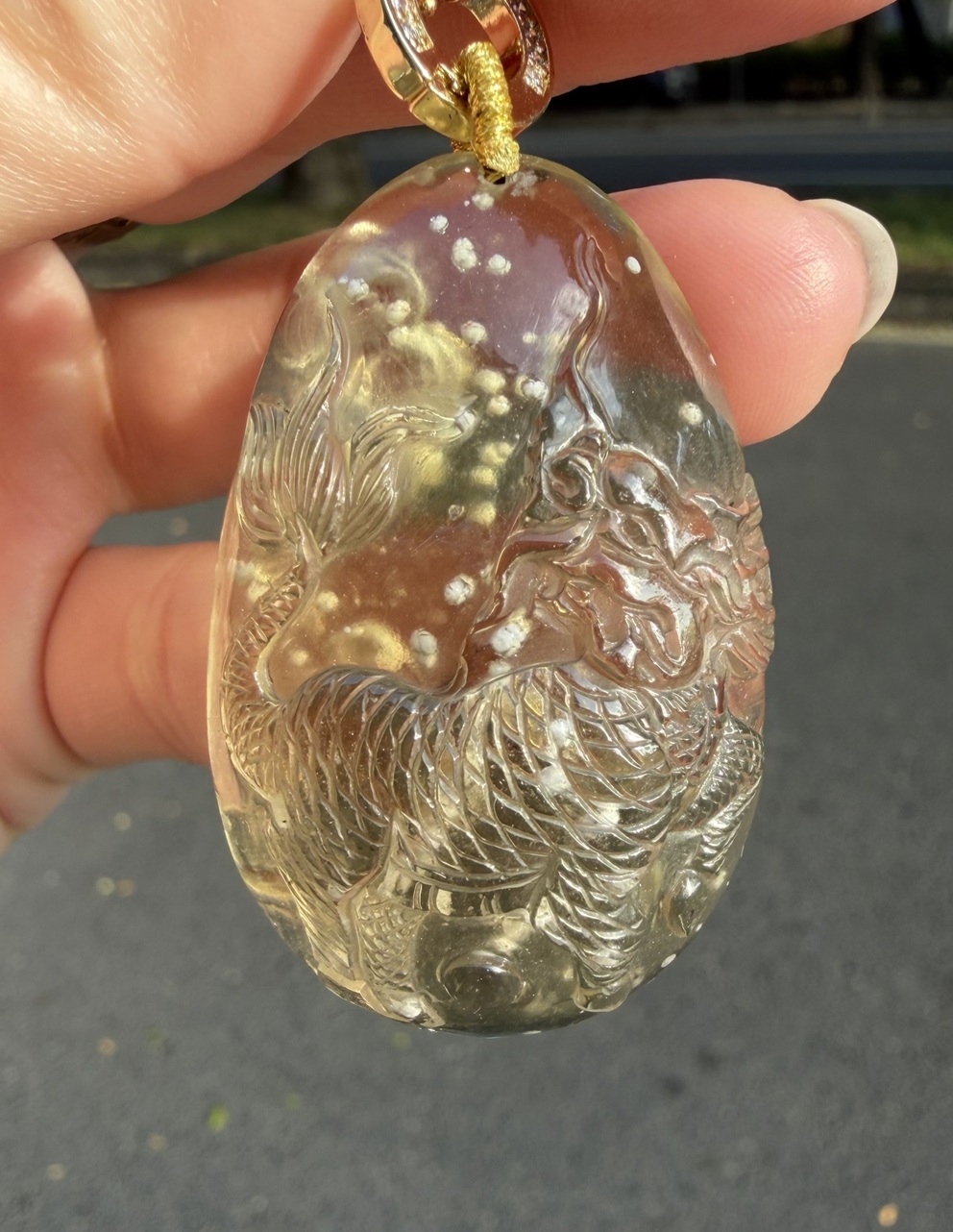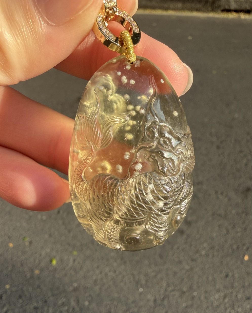 ✨這顆晶體在陽光下晶體透體大雪花~正面手工雕刻著神獸麒麟.背面雕祥雲.都清晰可見晶體內的大雪花~整顆吊墜非常厚實^^