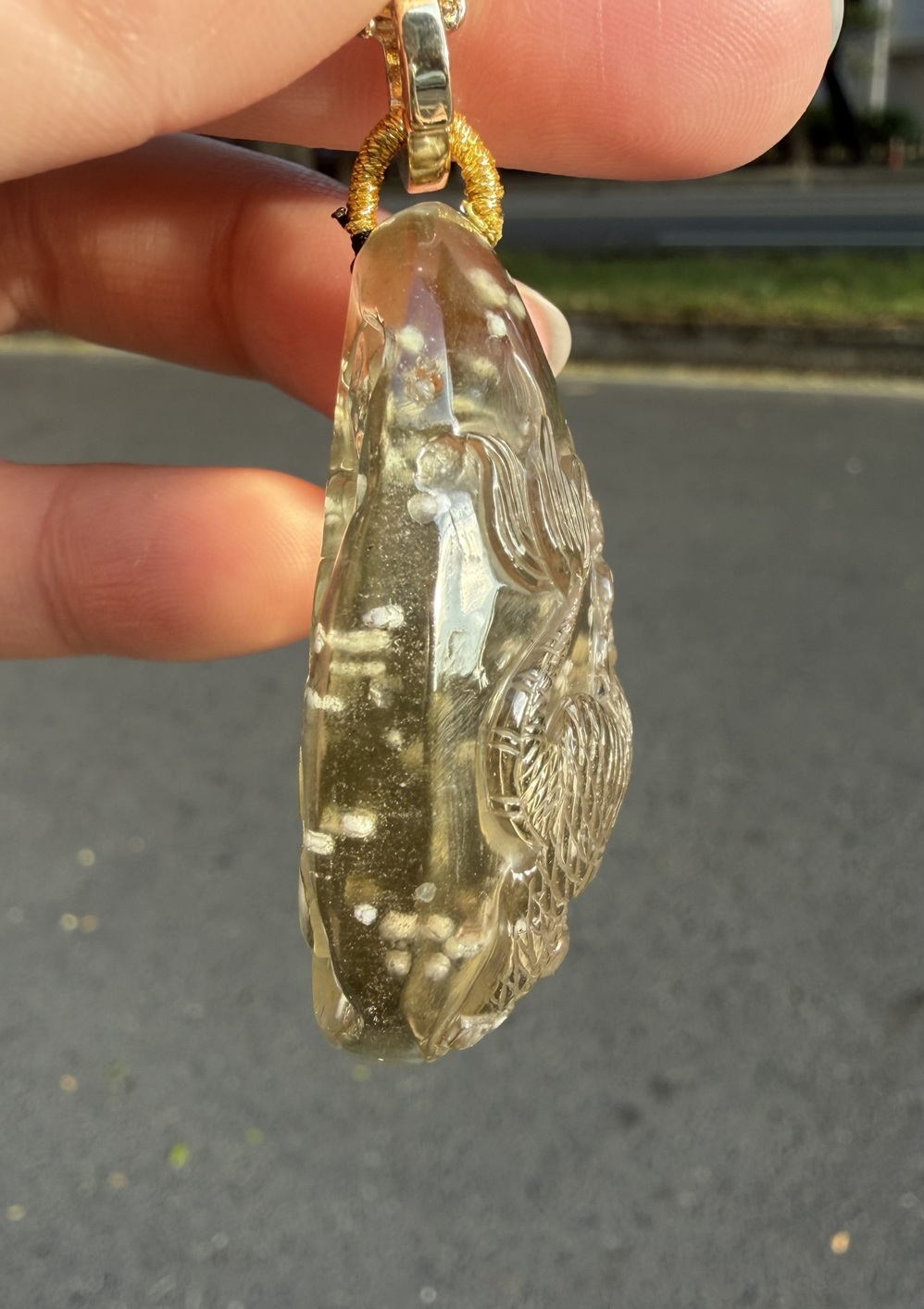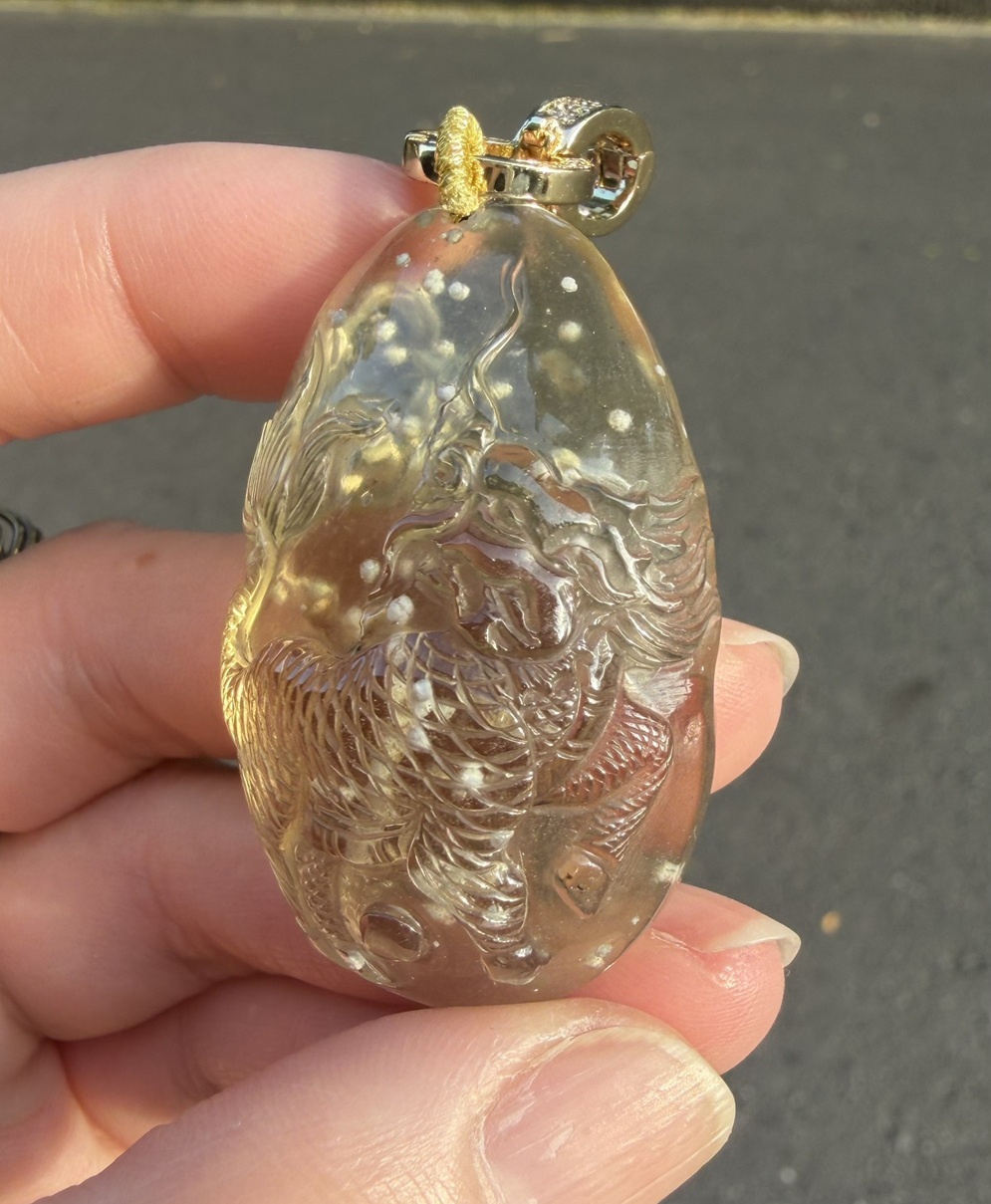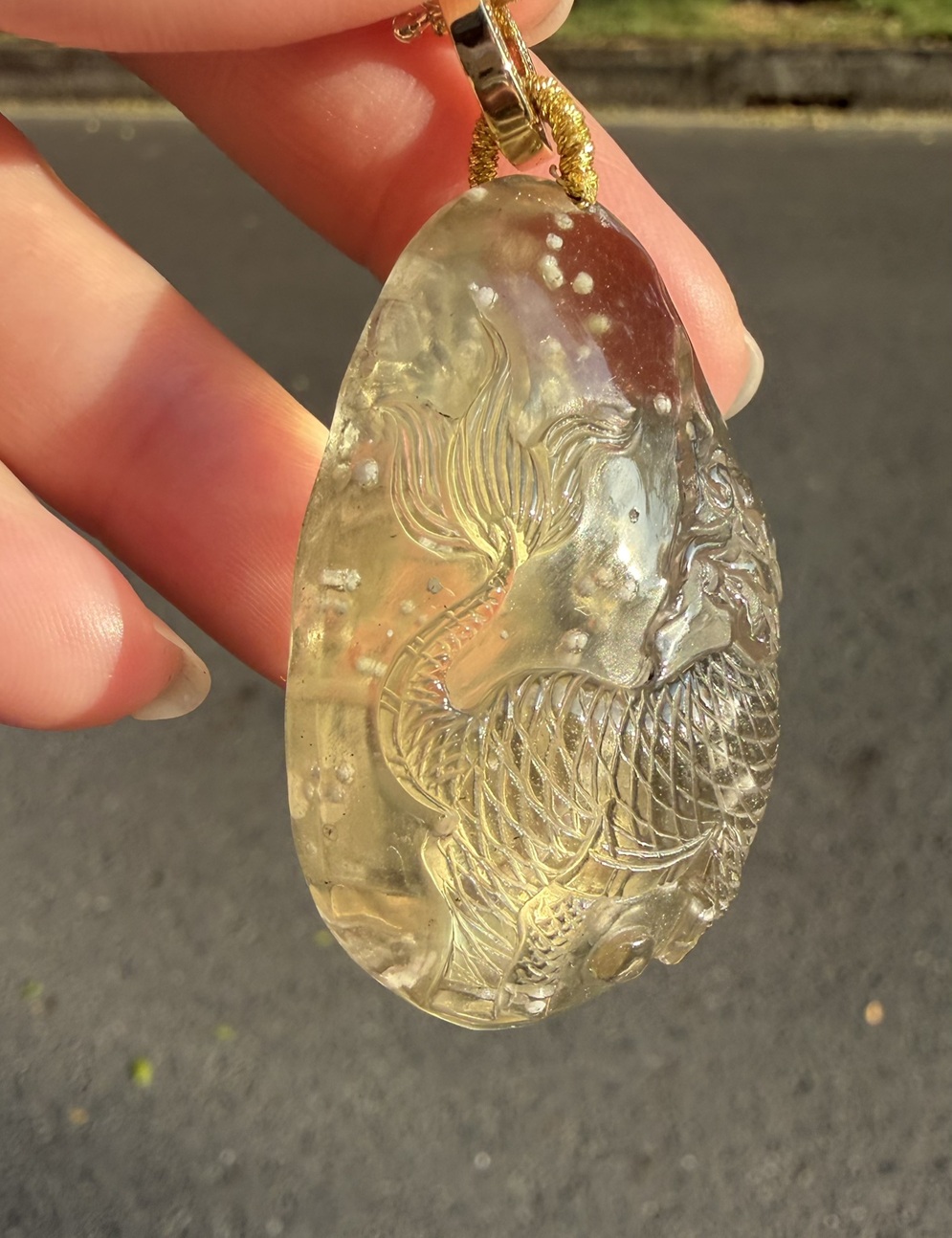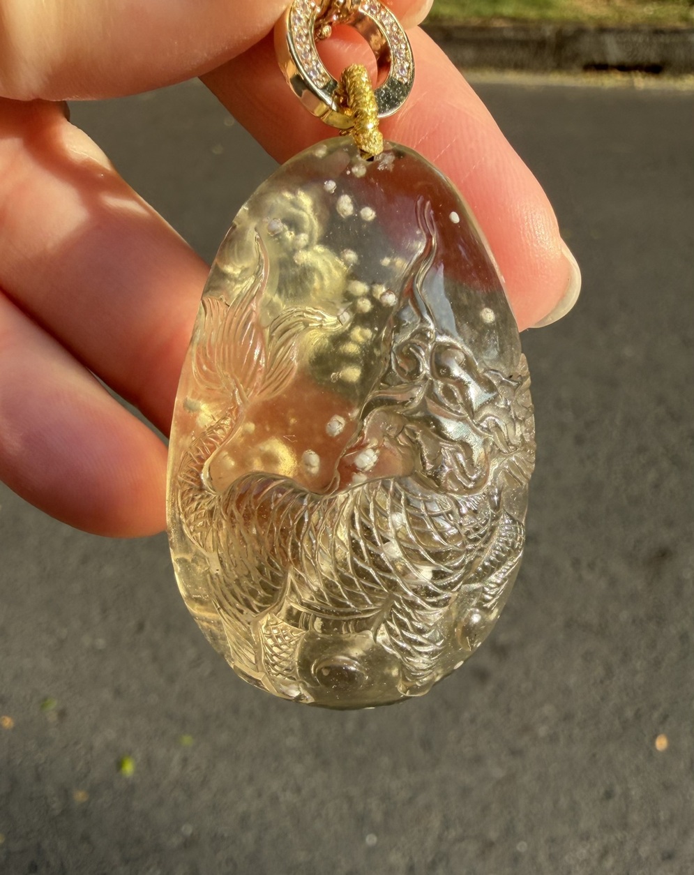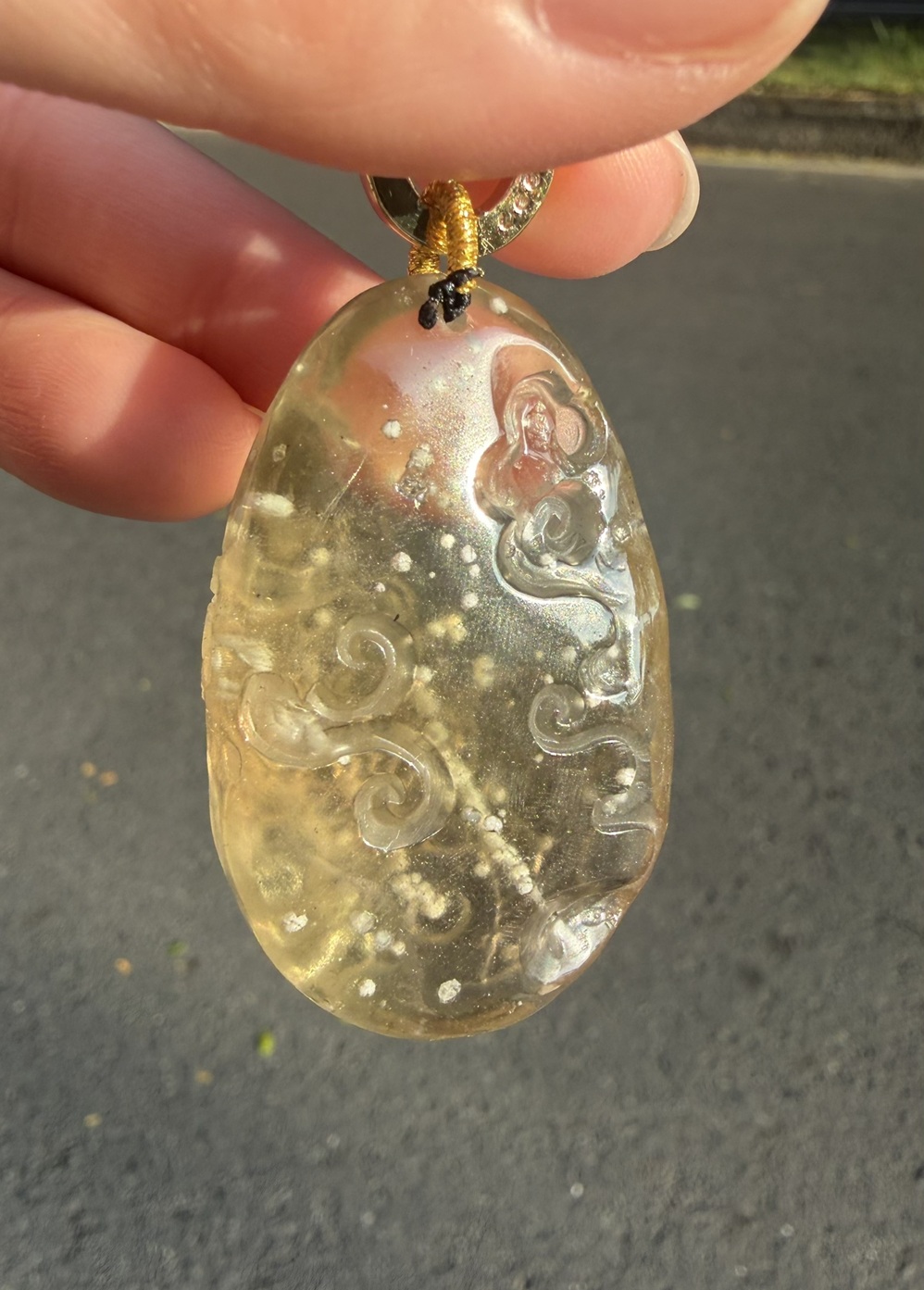 ✨這顆晶體在陽光下晶體透體大雪花~正面手工雕刻著神獸麒麟.背面雕祥雲.都清晰可見晶體內的大雪花~整顆吊墜非常厚實^^
