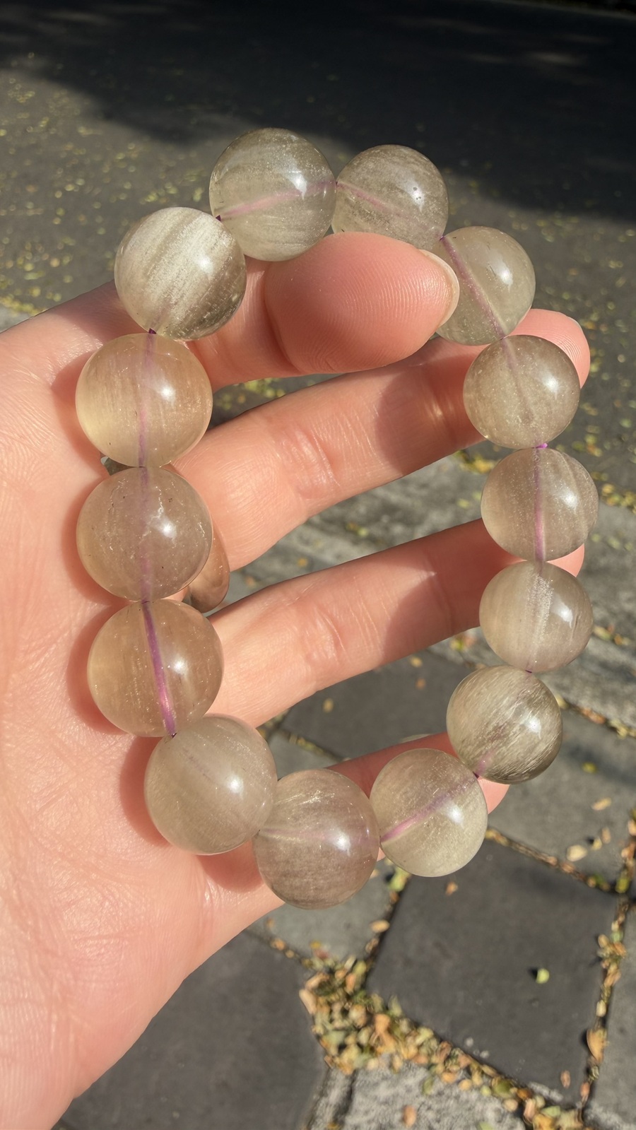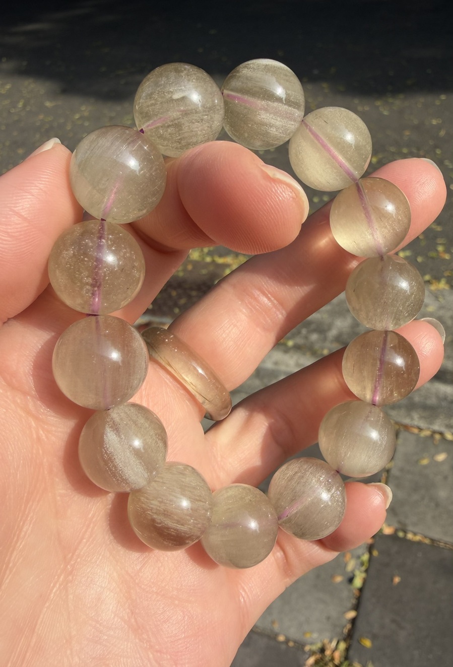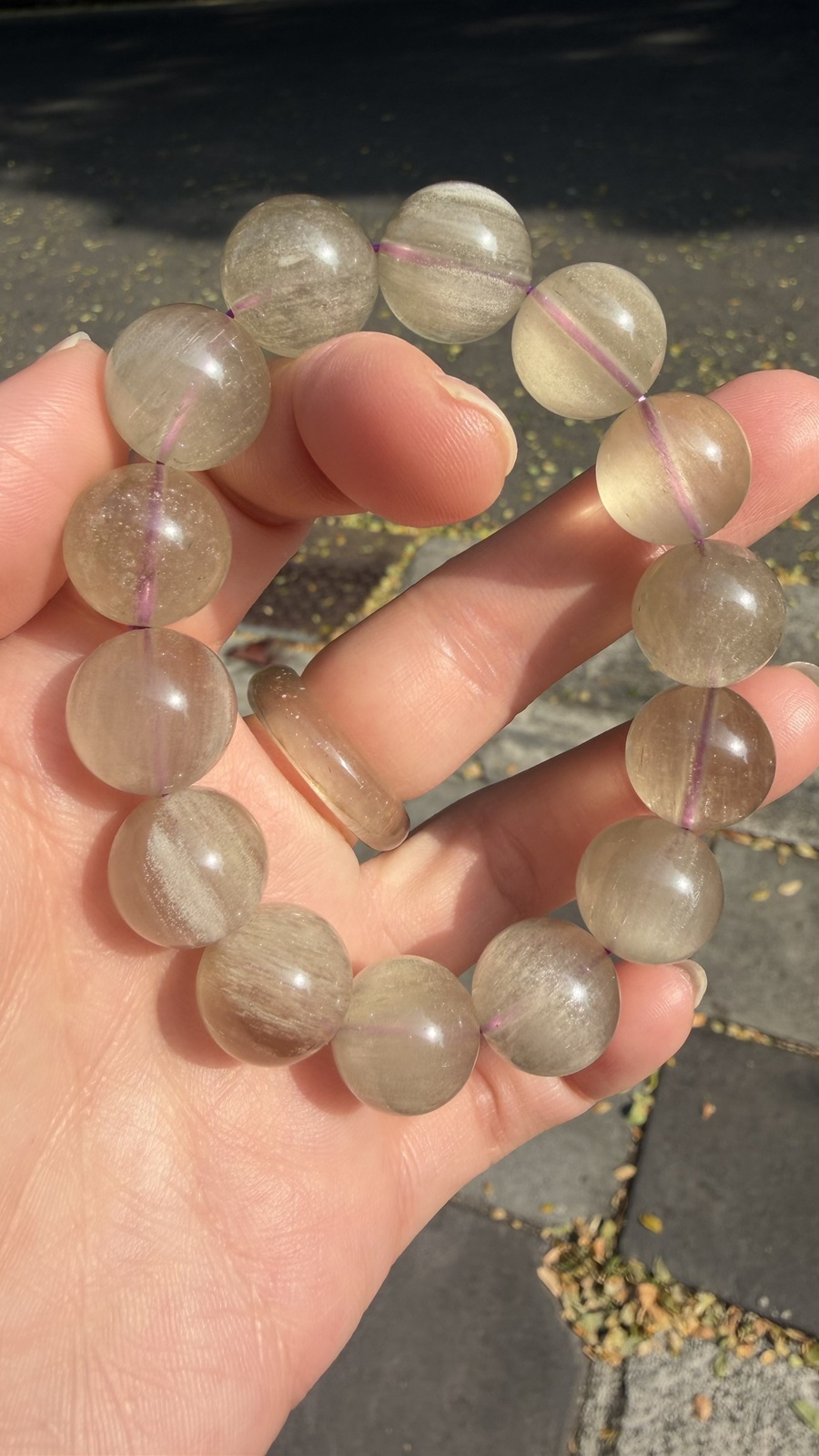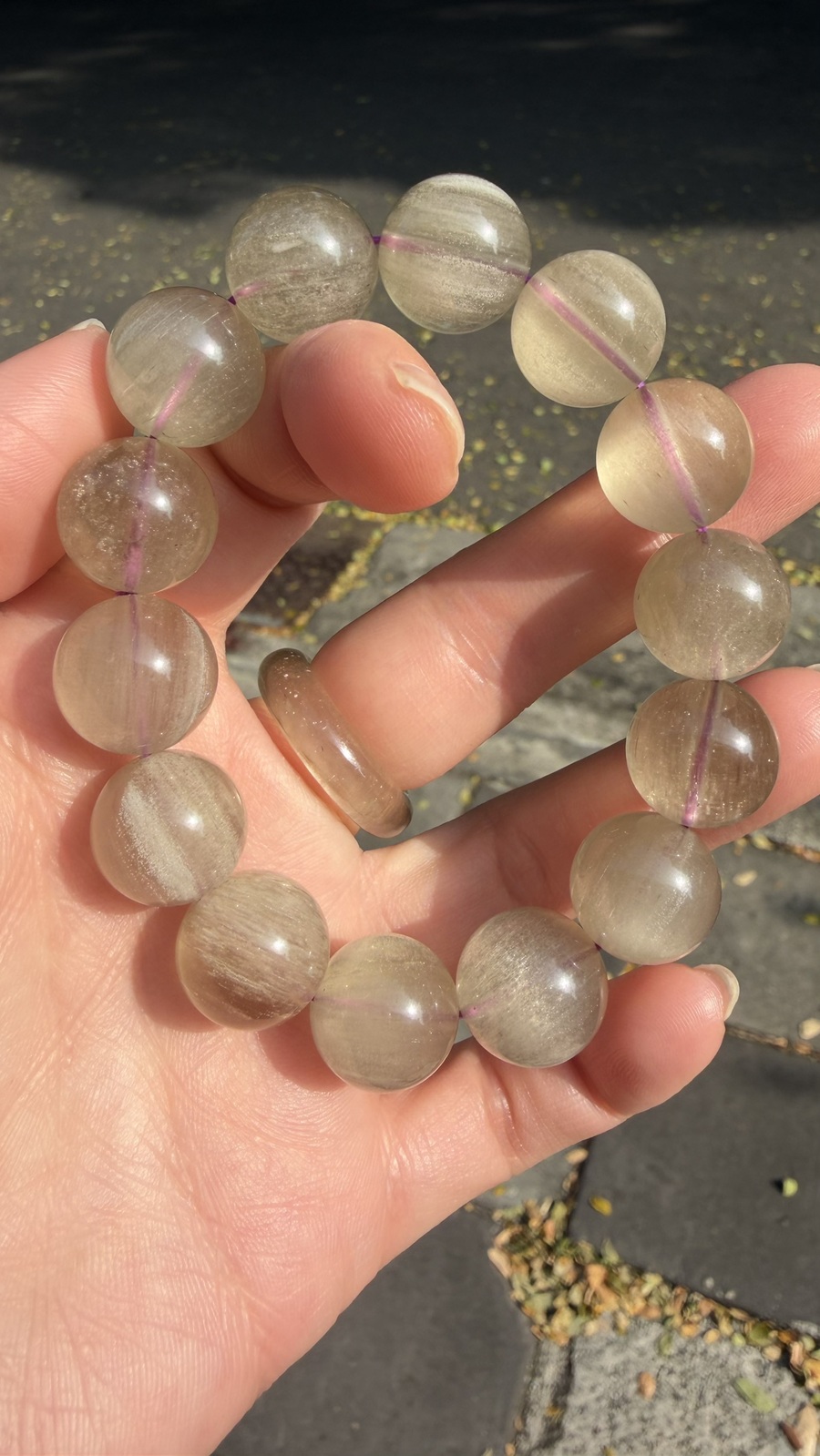 煙紫色的主色晶體在陽光下轉動珠子會呈現出紫色貓眼光感~上手非常顯白好看^^