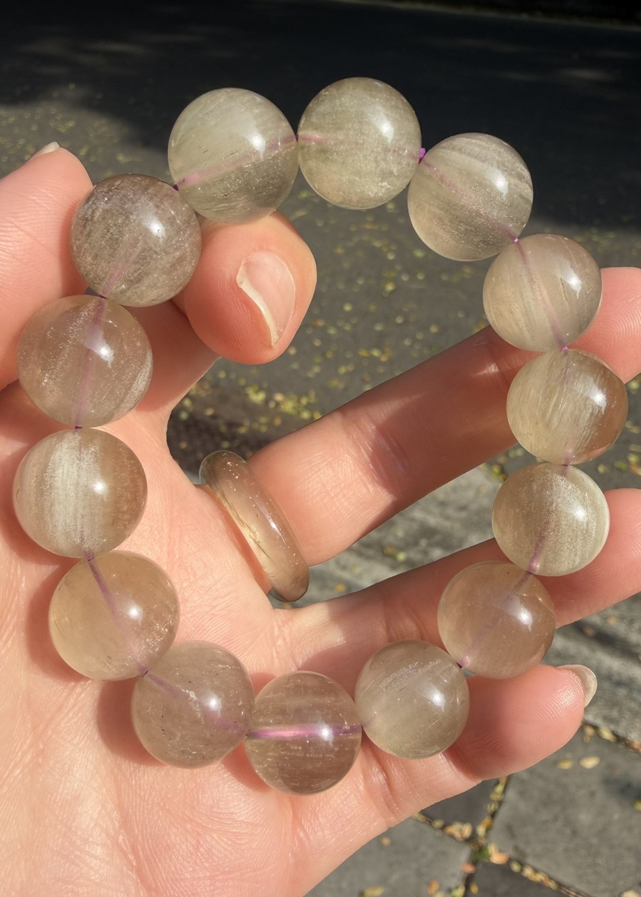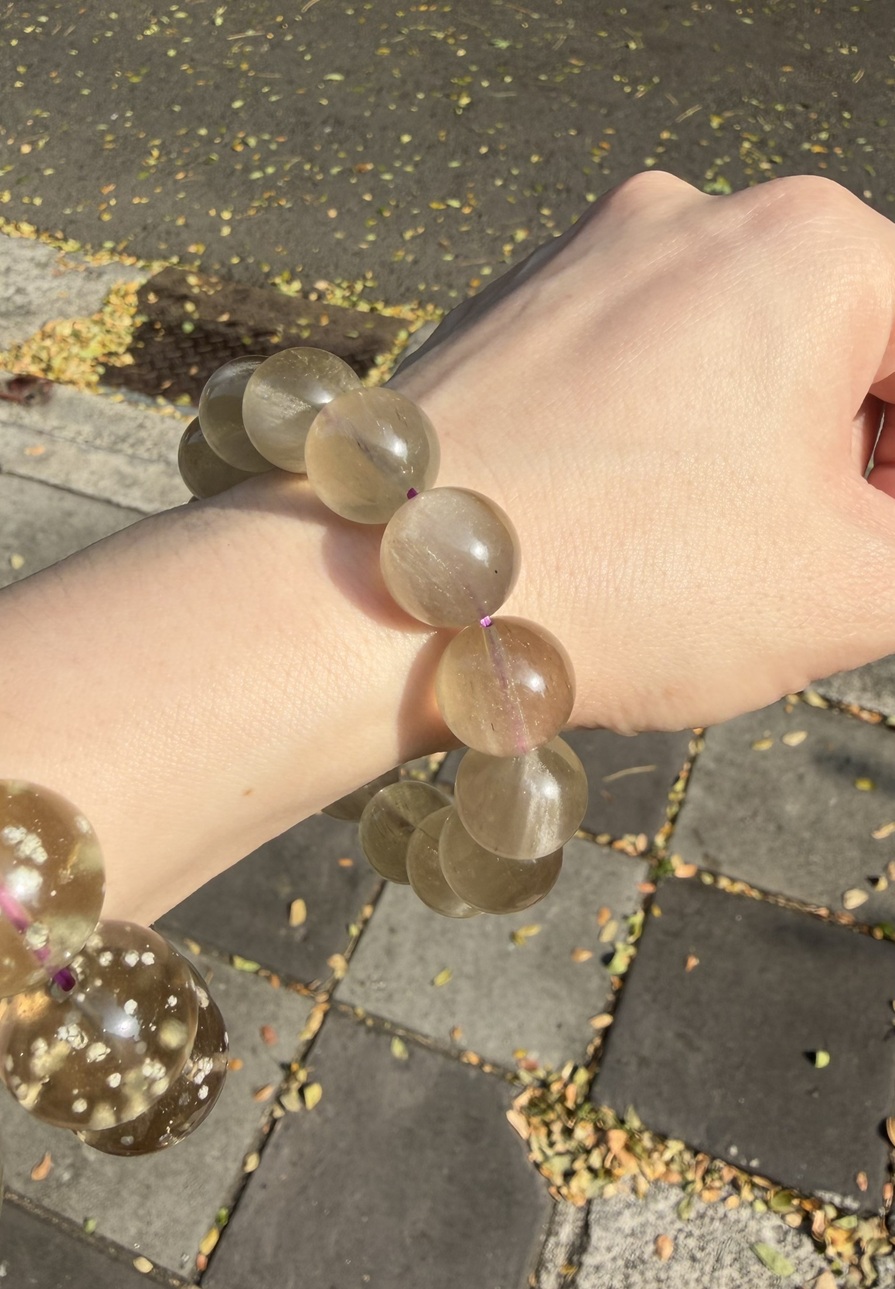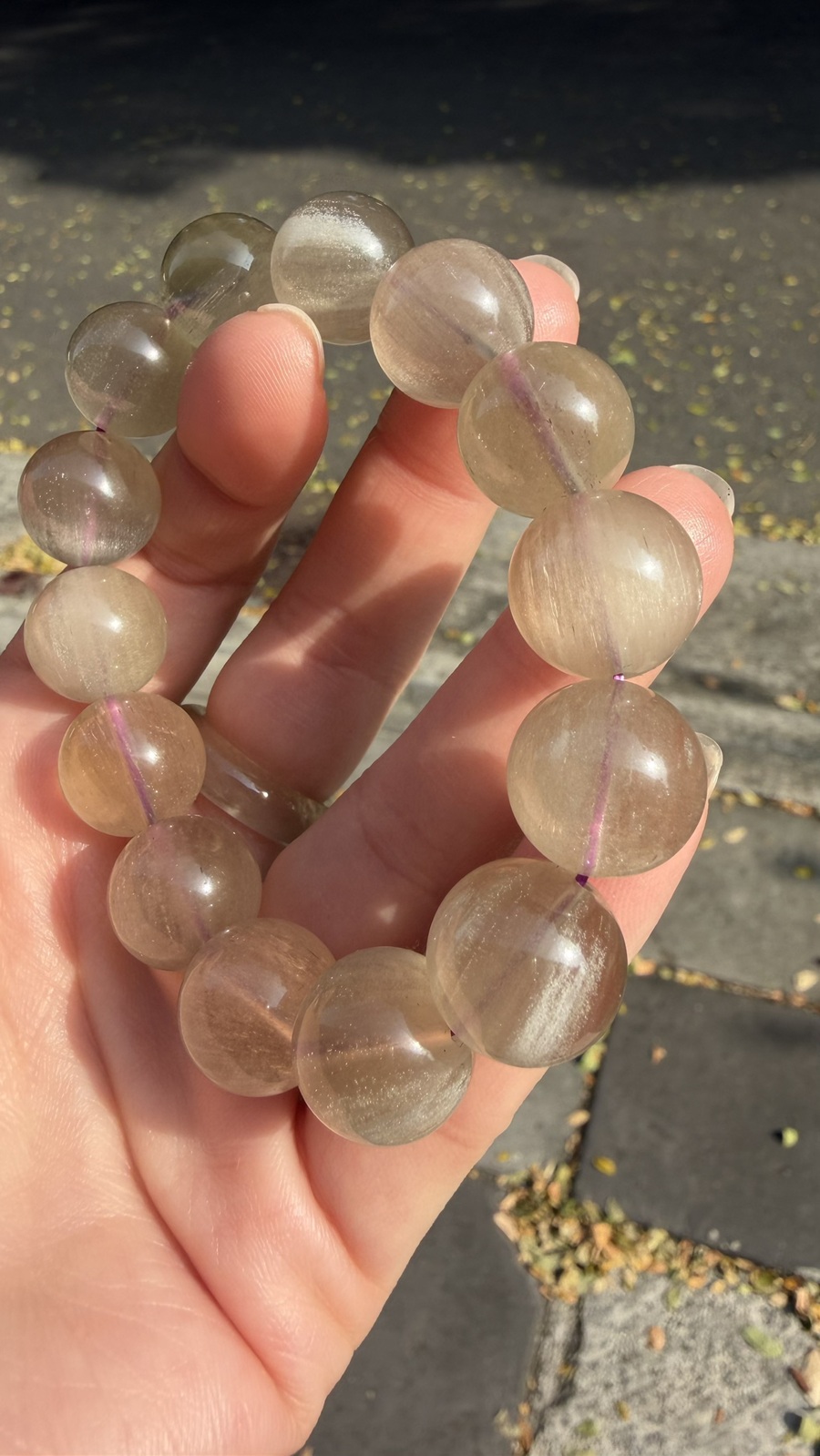 煙紫色的主色晶體在陽光下轉動珠子會呈現出紫色貓眼光感~上手非常顯白好看^^