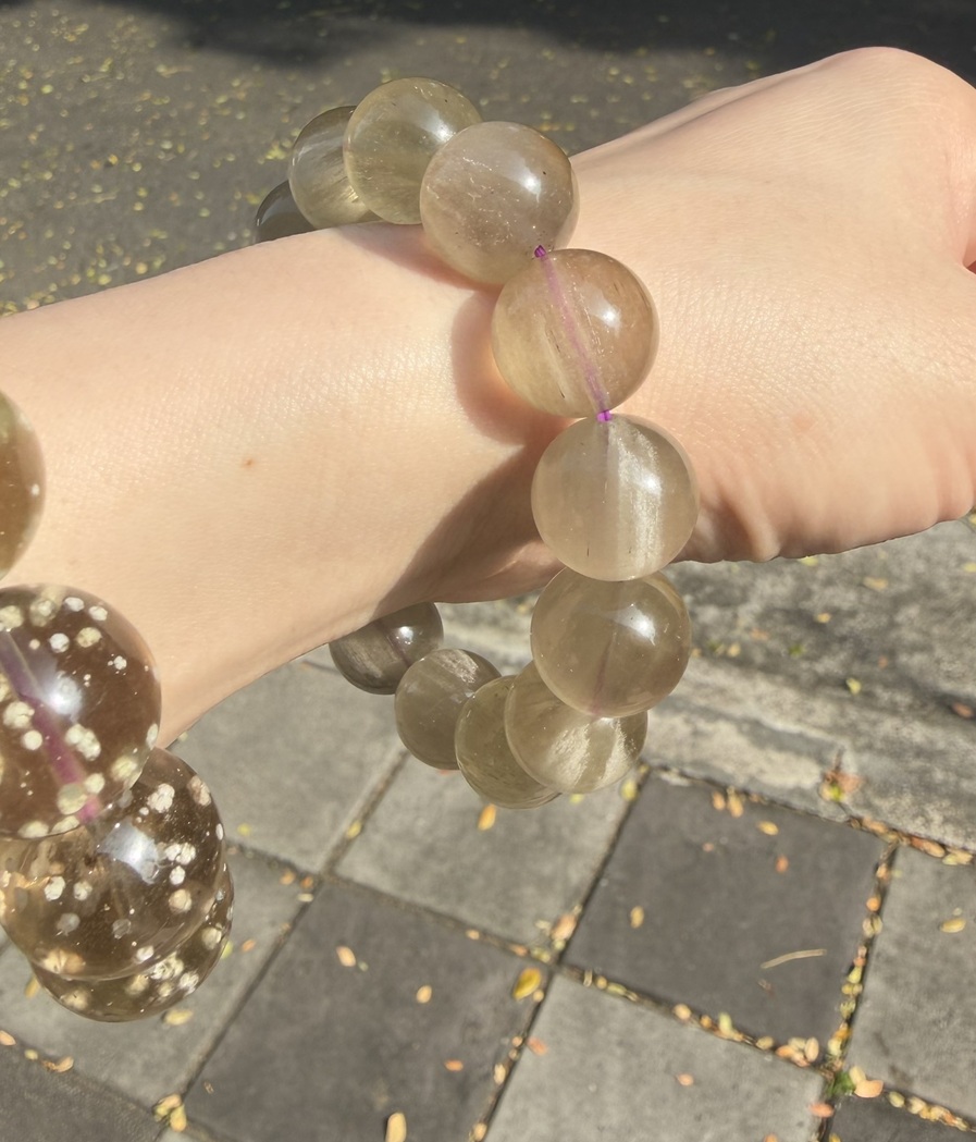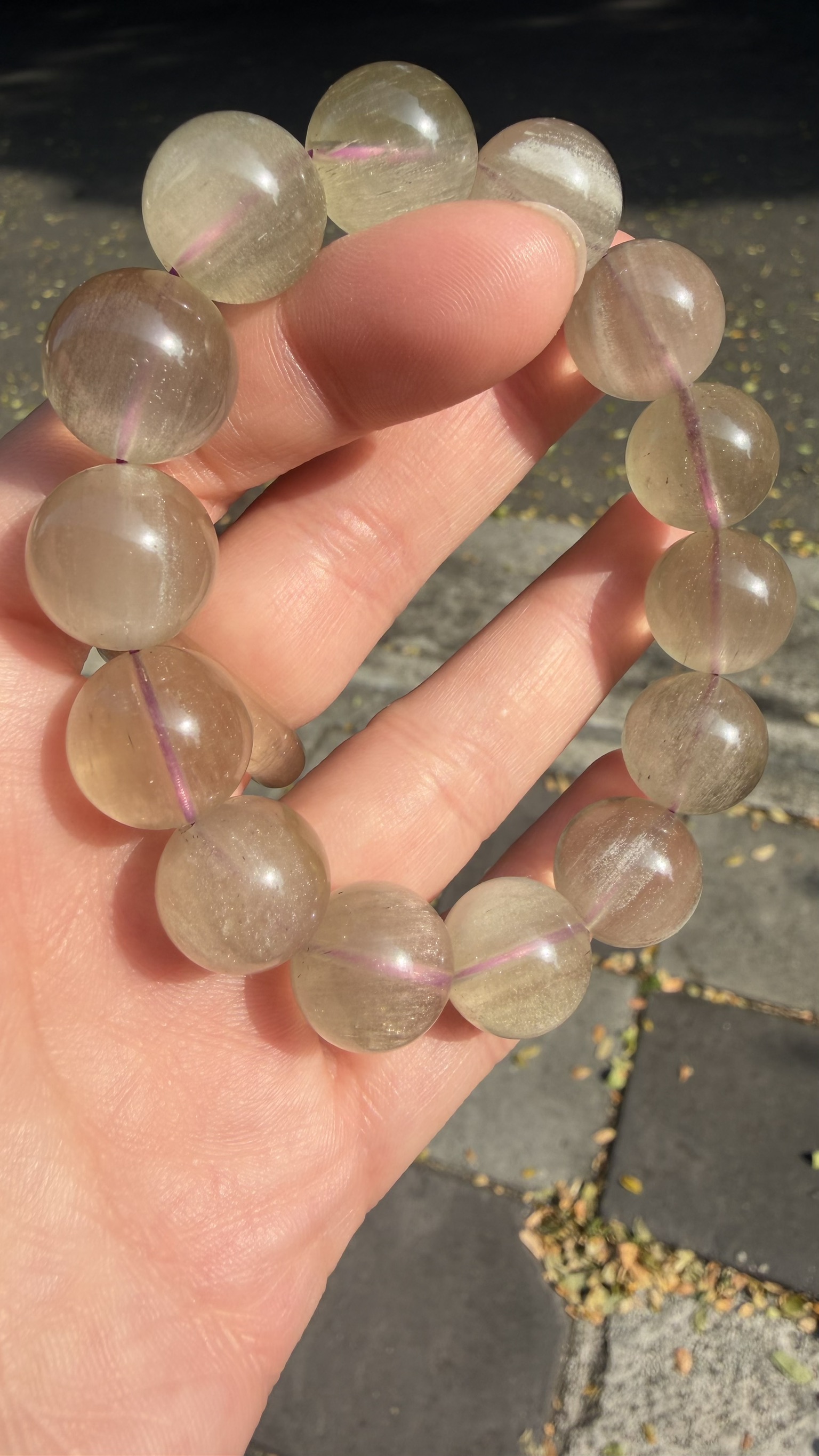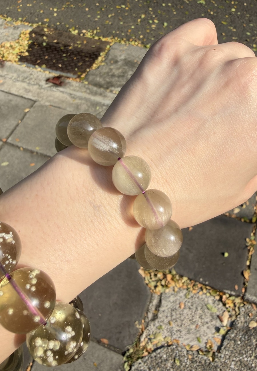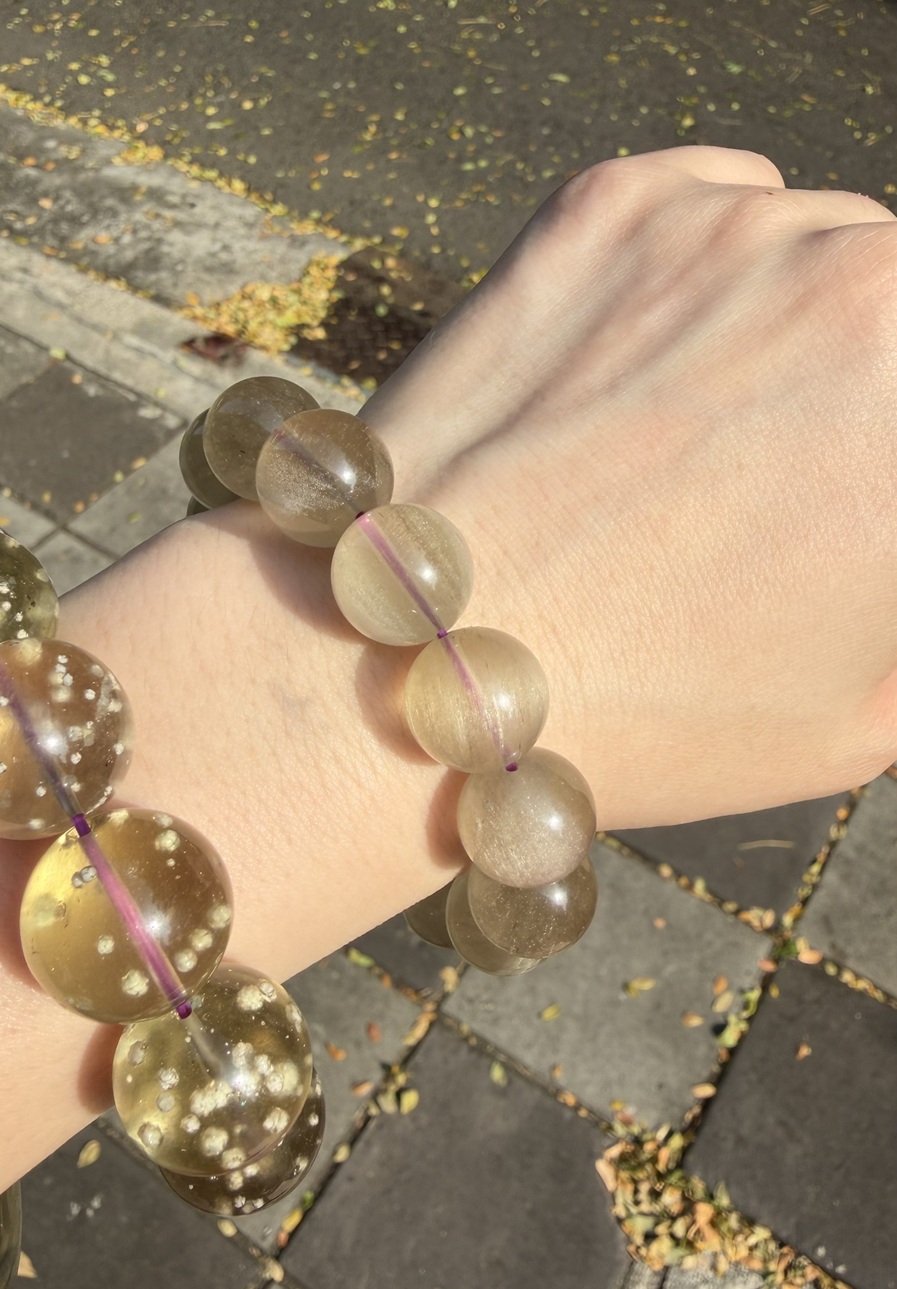煙紫色的主色晶體在陽光下轉動珠子會呈現出紫色貓眼光感~上手非常顯白好看^^
