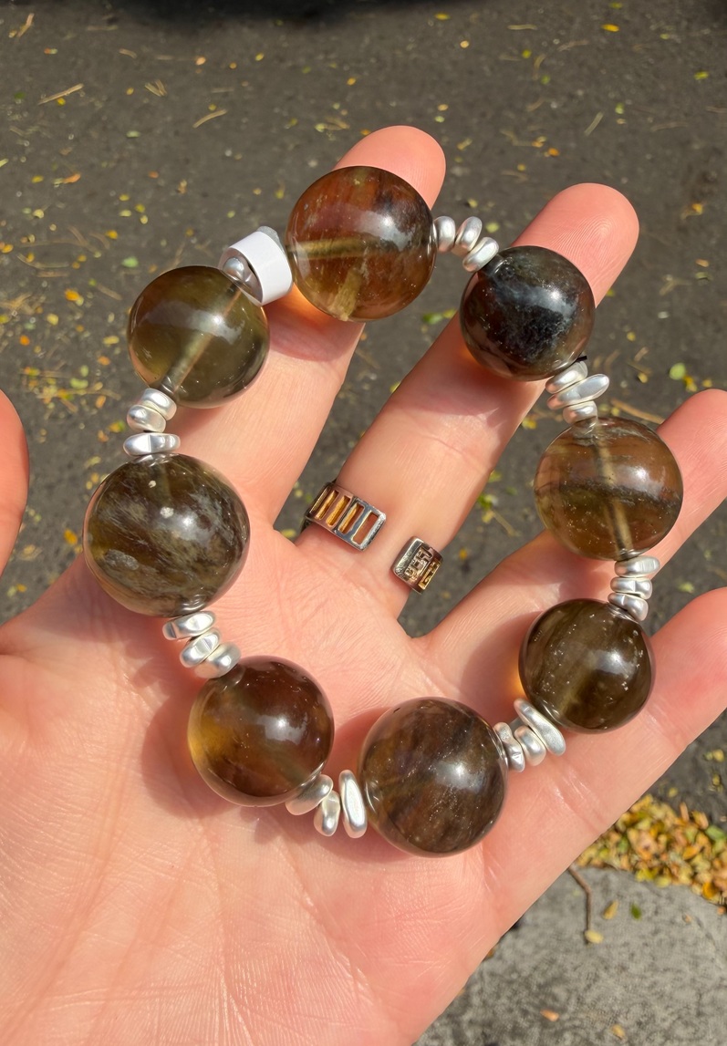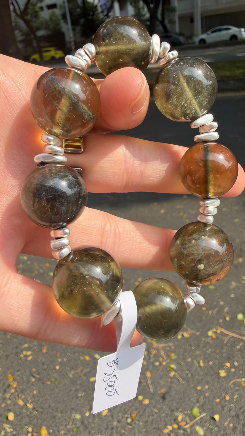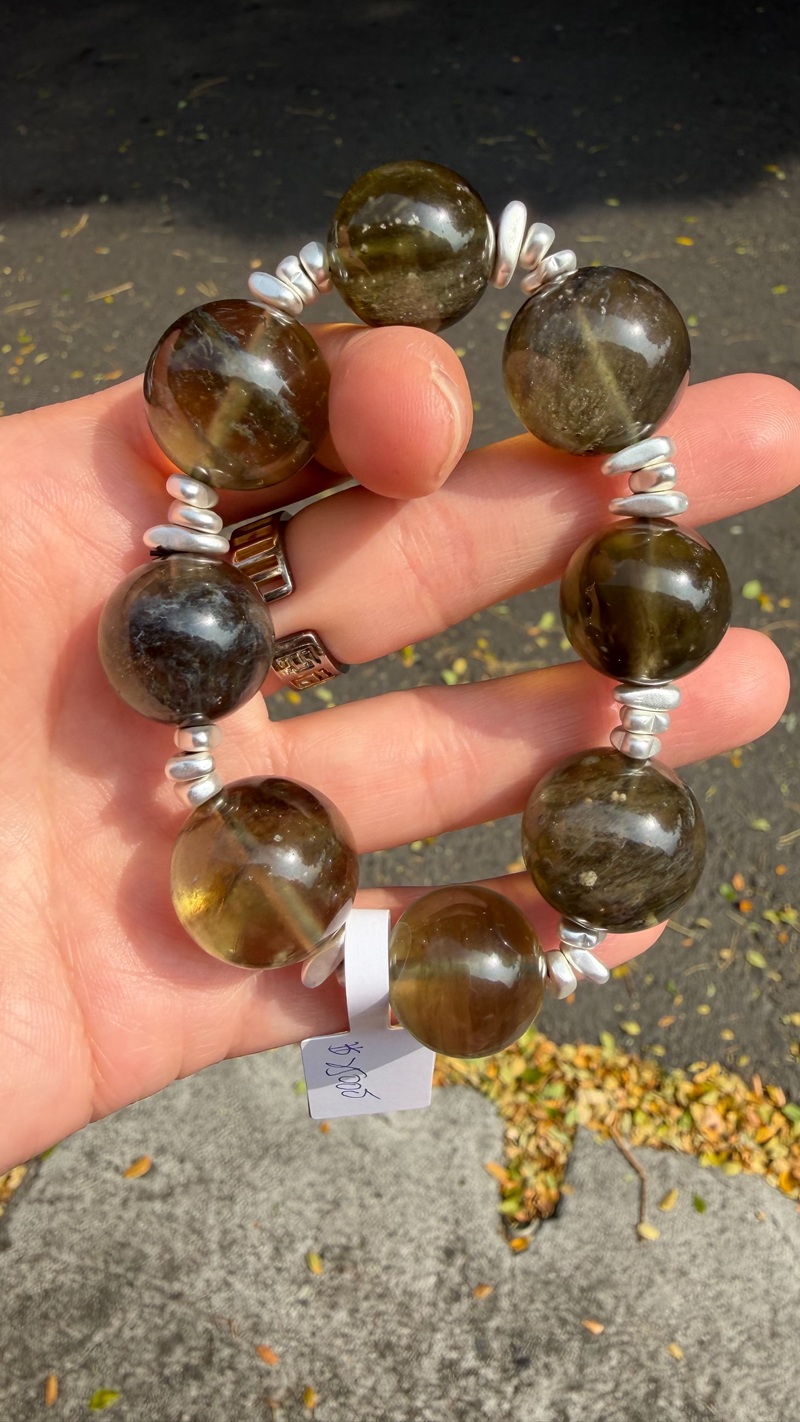 ✨這串晶體是濃色大黑金藍針.由18mm跟20mm的大珠子設計成一串.珠子裡面有非常多的千層雲霧+藍針.有的還帶氣泡跟雪花.戴上手非常顯白~