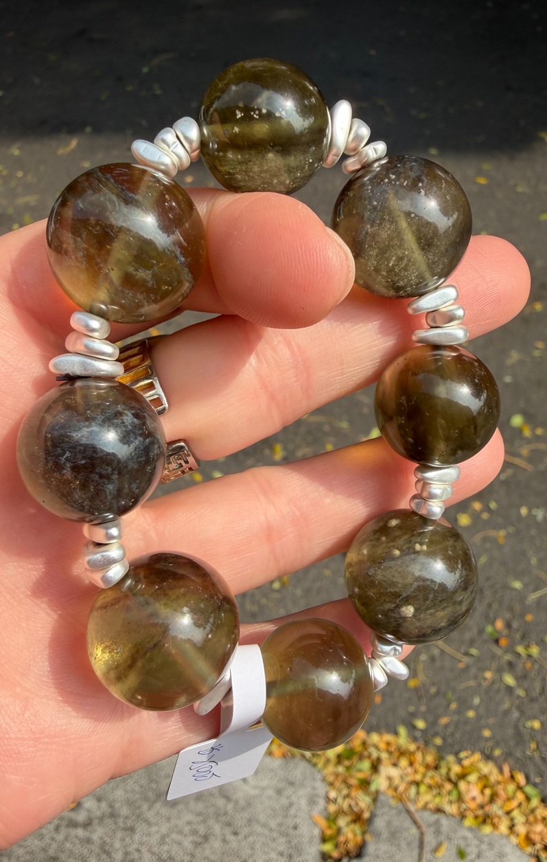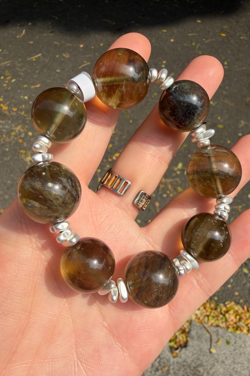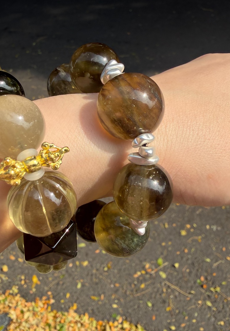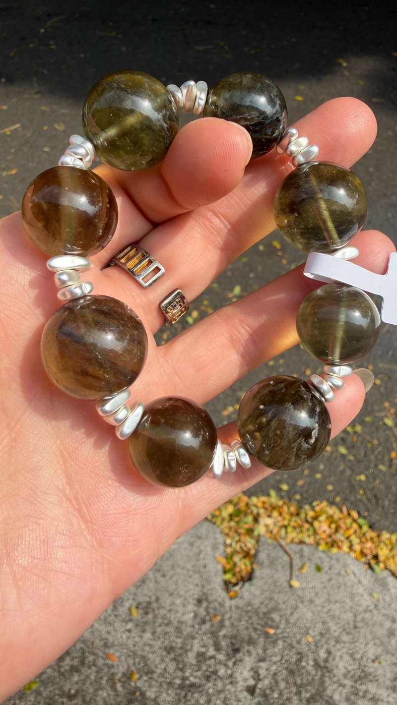 ✨這串晶體是濃色大黑金藍針.由18mm跟20mm的大珠子設計成一串.珠子裡面有非常多的千層雲霧+藍針.有的還帶氣泡跟雪花.戴上手非常顯白~